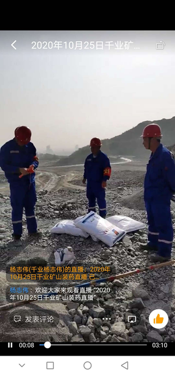 近日,焦作市公安局支隊(duì)領(lǐng)導(dǎo)按照河南省廳民爆未端管控全視頻要求,建立了覆蓋全市可視頻的釘釘群,組織了焦作市轄區(qū)爆破作業(yè)人員本群,對爆破作業(yè)進(jìn)行全程跟蹤管理。馬村分公司積極響應(yīng)南省民爆末端管控全視頻要求,組織爆破作業(yè)相關(guān)人員進(jìn)入“焦作市爆破作業(yè)管控群”,利用將爆破現(xiàn)場進(jìn)行直播,主要直播人員到位情況(三大員及工程技術(shù)人員是否到位)、卸車、電子雷管入庫、裝填、起爆等視頻。 在爆破作業(yè)中,首先,現(xiàn)場人員全部到位,包括爆破工程技術(shù)人員1名,爆破員2名,安全員1名,保管員2名,持各自人員名片進(jìn)行報(bào)到。  當(dāng)運(yùn)輸巖石粉狀大包和電子雷管的車到達(dá)作業(yè)地點(diǎn)后,對數(shù)量進(jìn)行清點(diǎn),卸車。直播開始。  下圖為將電子雷管進(jìn)行入庫。  下圖為爆破員進(jìn)行裝填直播。 最后,起爆直播。 馬村分公司經(jīng)過三天釘釘視頻直播的摸索與實(shí)踐,逐步建立起完整可行的直播過程,且受到市局相關(guān)領(lǐng)導(dǎo)的口頭表揚(yáng)。馬村分公司將會一直嚴(yán)格按照焦作市局要求,利用釘釘直播,實(shí)現(xiàn)民爆末端管控全視頻要求。 |