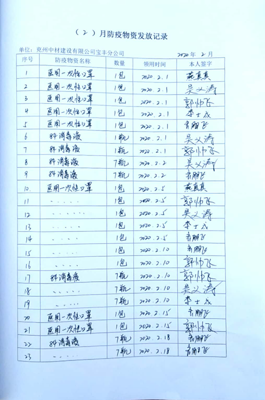 (3)體溫篩查。每天對當班人員進行兩次體溫篩查,上班前、下班前各一次,填寫記錄臺賬,并報送疫情防控領導小組。 (4)佩戴口罩。要求在崗員工必須主動佩戴口罩,掌握正確佩戴口罩的方法,隊伍不佩戴口罩人員,一律禁止進入辦公及生產場所,并進行嚴肅處理。 (5)分散就餐。返崗人員施行分散就餐,錯峰就餐制,嚴禁在食堂集中就餐。餐廳工作人員施行封閉式管理,吃住在生活區,并安排專人到縣防控指揮部制定超市采購米、面、油、蔬菜等食材。 (6)開窗通風。辦公場所、生產車間、食堂等公共場所保持開窗通風,并對空調進行消毒。 (7)嚴格防疫物資領用。防疫物資根據按需領取的原則,嚴禁浪費。領用人按制度規定填寫領用臺賬。  (8)設立臨時隔離室。寶豐分公司在礦山上設立意見臨時隔離室,用于臨時出現發熱異常狀況的人員進行隔離。  (9)減產集聚。停止員工非必要集聚,盡量采取視頻會議、微信、電話等交流形式,最大限度減少集聚性的室內活動。 (10)加強外來人員管理。對非本單位來訪人員從嚴控制,原則上不予入內。確有來訪需求人員,須出示工作證或介紹信等有效證明,并由接訪人員派專人接待,并對來訪人員進行提問篩查,詳細登記個人信息。