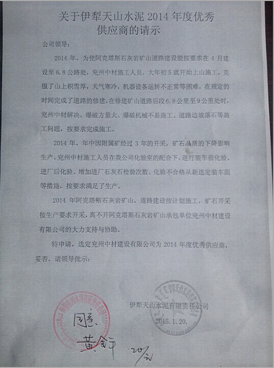 兗州中材建設有限公司被伊利天山水泥評為2014年度優秀供應商