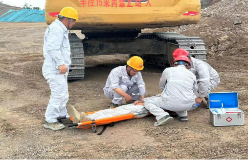本次演練主要模擬515平臺發(fā)生車輛傷害事故,一名員工被挖機回轉時碰傷倒地,頭部撞擊受傷,傷情嚴重,進行緊急救援的情景。