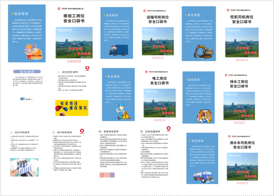口袋書封面背頁以安全為主題,與生產相結合,內容包括安全文化標語、口號、個人安全承諾、具體崗位職責要求、風險辨識、操作規(guī)范、隱患排查、應急處置等。